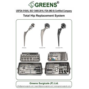 Greens Surgicals Pvt Ltd is a distinguished manufacturer specializing in advanced medical solutions for orthopaedic care. With a profound focus on precision, innovation, and patient well-being, our company stands as a premier provider of spine, trauma, and hip joint medical devices. Our commitment to excellence is underscored by our impressive array of certifications, including USFDA 510(k), USFDA (FSC), TMDA and ISO 13485:2016, attesting to our dedication to uncompromising quality and regulatory compliance.