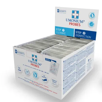 UMONIUM38® Probes is a ready-to-use fast acting disinfecting wipe (MD Class IIB) for ultrasound probes (semi-critical medical devices) in gynaecology, cardiology, ENT, urology and much more, super easy (only 2 wipes for the total disinfection process of the probe AND the peripheries). It has been validated by the major probes, endoscopes manufacturer (Esaote, Fujifilm, Hitachi, GE, Samsung…) and is non toxic for the operator, the patient, the equipment and the environment while offering a large spectrum of disinfection including sporicidal and SV40 and without VOC emission.